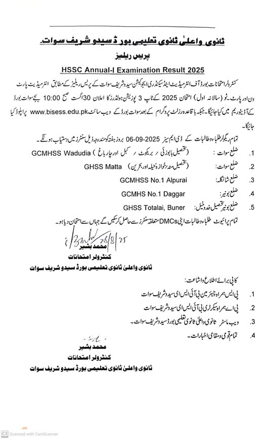 Swat, The Board of Intermediate and Secondary Education BISE Swat has officially announced that the HSSC Part I & II Annual Examination 2025 Results will be declared on Saturday, 30 August 2025 at 10:00 AM.