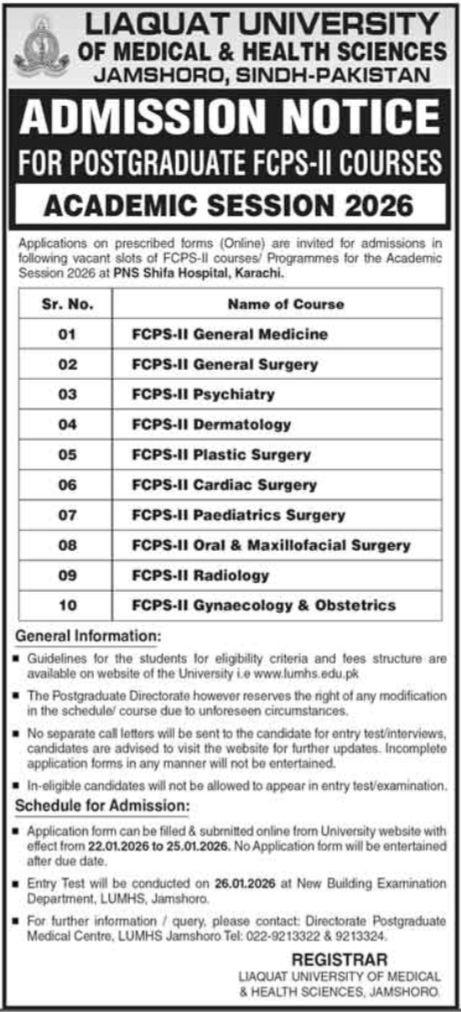 The medical community in Sindh is set for a significant academic boost as the Liaquat University of Medical & Health Sciences officially opens its doors for the upcoming year. This prestigious institution has released an official admission notice for various vacant slots in its highly sought-after FCPS-II programs. The LUMHS Admissions 2026 cycle is specifically designed for medical professionals looking to specialize in advanced clinical fields at the PNS Shifa Hospital in Karachi.