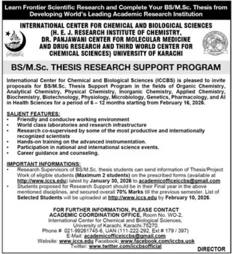 The University of Karachi has officially opened an outstanding academic opportunity under Admissions 2026, offering students a chance to learn frontier scientific research and complete their BS/M.Sc. thesis at the International Center for Chemical and Biological Sciences ICCBS. This globally recognized research institution is home to the H.E.J. Research Institute of Chemistry, Dr. Panjwani Center for Molecular Medicine and Drug Research, and the Third World Center for Chemical Sciences, making UOK Admissions 2026 highly competitive and prestigious.