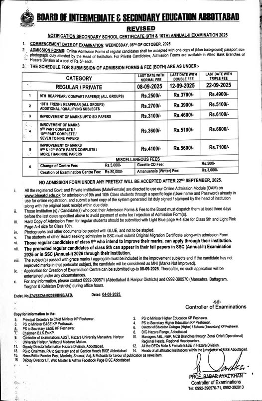 Abbottabad Matric 2nd Annual Exams 2025 Revised Forms Schedule
