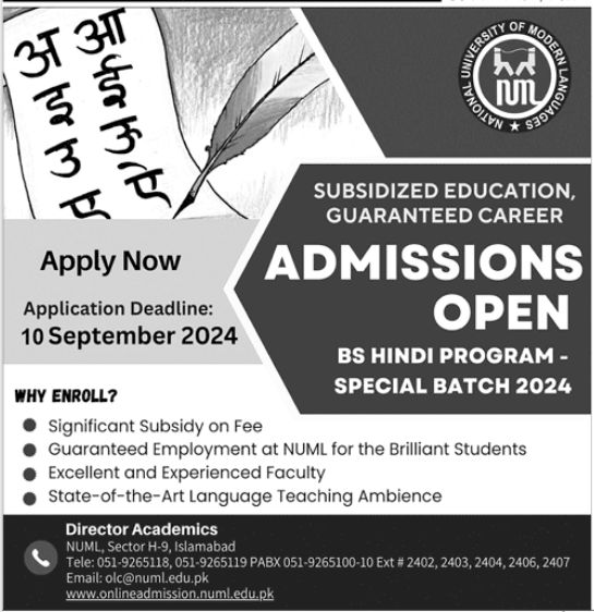 The National University of Modern Languages NUML, Islamabad, has announced admissions for a special batch of its BS Hindi program for Fall 2024. This is a unique opportunity for students interested in pursuing a career in Hindi language studies, with the added benefits of significant fee subsidies and a guaranteed career path for top-performing students.