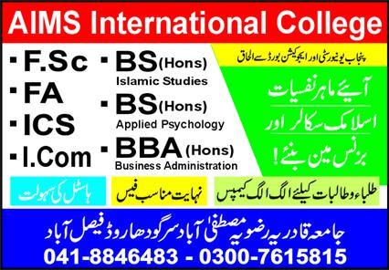 AIMS International College, an institution committed to academic excellence and moral development, is now accepting applications for the upcoming academic session. The college offers a diverse range of intermediate and bachelor programs under the affiliation of Punjab University and respective Education Boards.