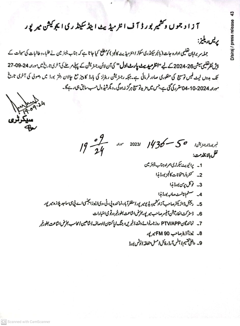 By adhering to the revised dates, students can ensure their successful admission into AJKBISE 1st Year Class without any issues. Dont miss the chance—submit your admission application before the 27th September 2024 deadline!