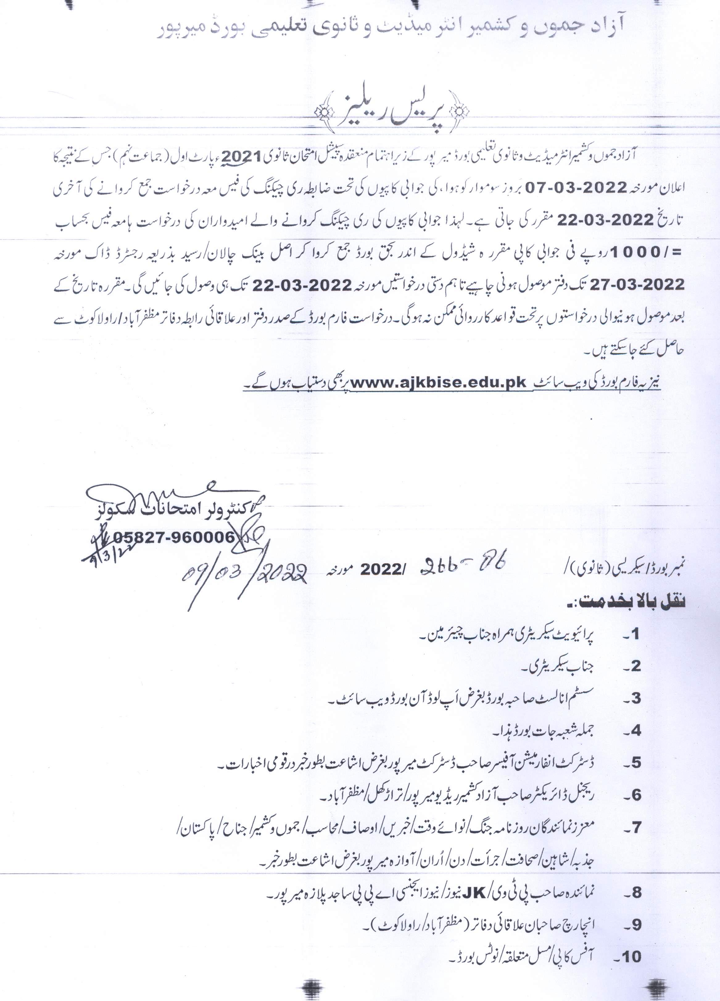 AJK Board SSC Part 1 Special Exams Result 2022 Re-Checking Schedule