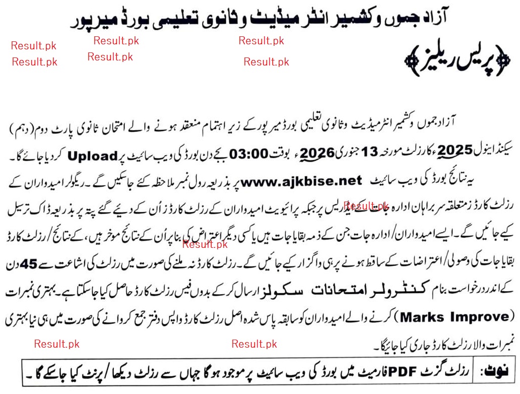 Mirpur, Board of Intermediate and Secondary Education Mirpur AJK has already conducted the matric class part 2 second annual exams for the year 2025 on the scheduled dates and time. Now the exams department of AJK Board has announced the AJKBISE 10th Class 2nd Annual Exams 2025 Result in the main hall of the board in the presence of teachers, students and their parents. The education board has uploaded the result of the matric class part 2 of the second annual exams on the official web page of the board.