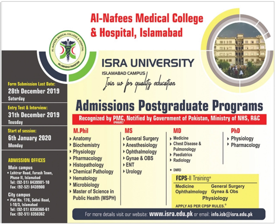 Al Nafees Medical College & Hospital Islamabad has announced admissions for MS in General Surgery, Anesthesiology, Ophthalmology, ENT, Urology, M.Phil in Anatomy, Biochemistry, Physiology, Pharmacology, Histopathology, Hematology, PhD in Physiology, Pharmacology. Last date for submission of admission applications is 28 Dec 2019. Entry Test date is 31 Dec 2019.