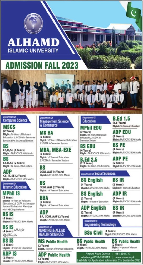 Alhamd Islamic University is a prestigious educational institution offering a diverse range of programs for individuals aspiring to excel in their chosen fields. The university provides educational opportunities in various departments, including Computer Science, Islamic Education, Management Science & Commerce, Nursing & Allied Health Sciences, Education, and Social Sciences. In this article, we will delve into the details of the academic offerings and admission requirements for the year 2023.