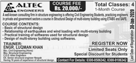 ALTEC Engineers announced the Admission for the session of 2020. The ALTEC Engineers has now starts the Admission in the Structural Design of Multi Storey Building.The last date of submission of form is 30th January, 2020.