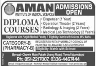 Aman Institute of Health Sciences Islamabad has announced admissions for Diploma Courses in Dispenser, Operation Theater, Radiology & Imaging, Medical Lab Technology, Category B, Pharmacy B. Matric with Science is eligibility for admission.