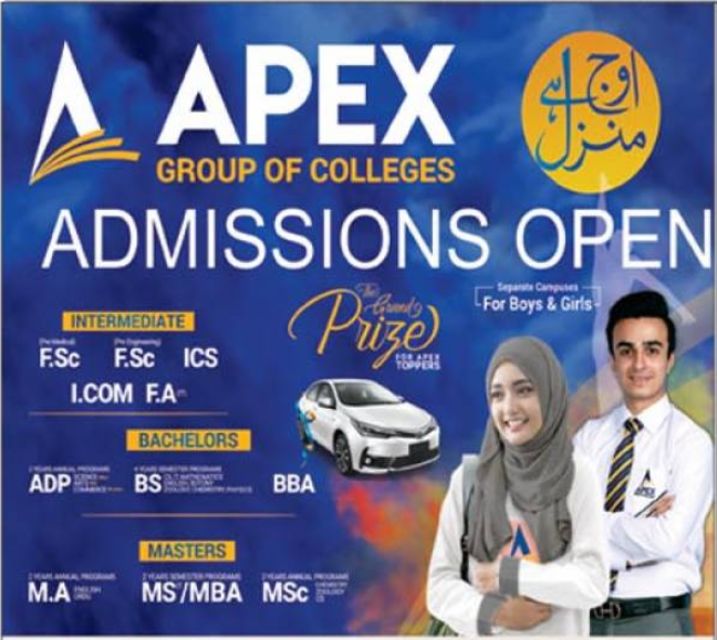Apex Group of Colleges invites applications for admissions 2021 in F.Sc Pre Engineering, F.Sc Pre Medical, ICS, I.Com. FA, ADP, BS, BBA, MA, MS, MBA, M.Sc in Islamabad. Separate campus for boys and girls.