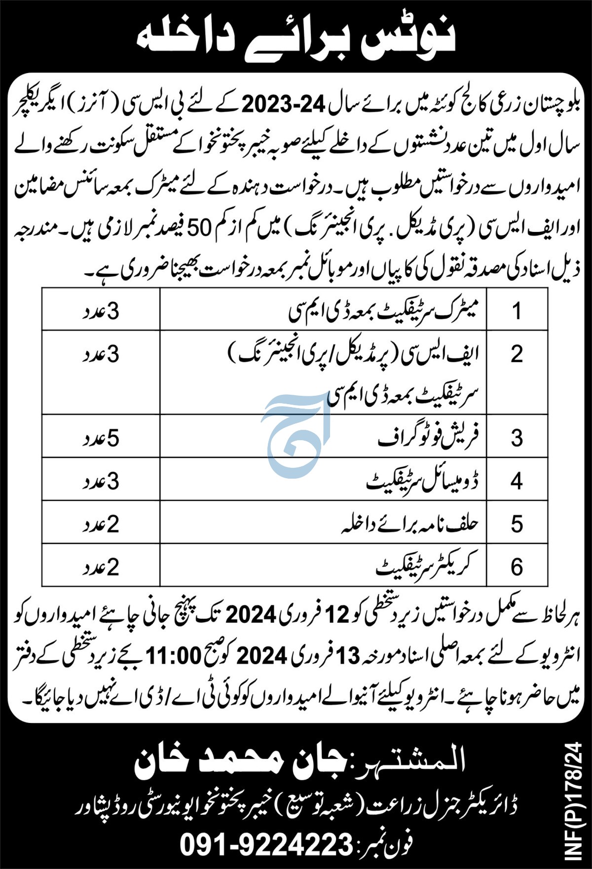 Notice for Admission 2024: Opportunity for B.Sc. Enrollment in Khyber Pakhtunkhwa Province Balochistan Agriculture College Quetta