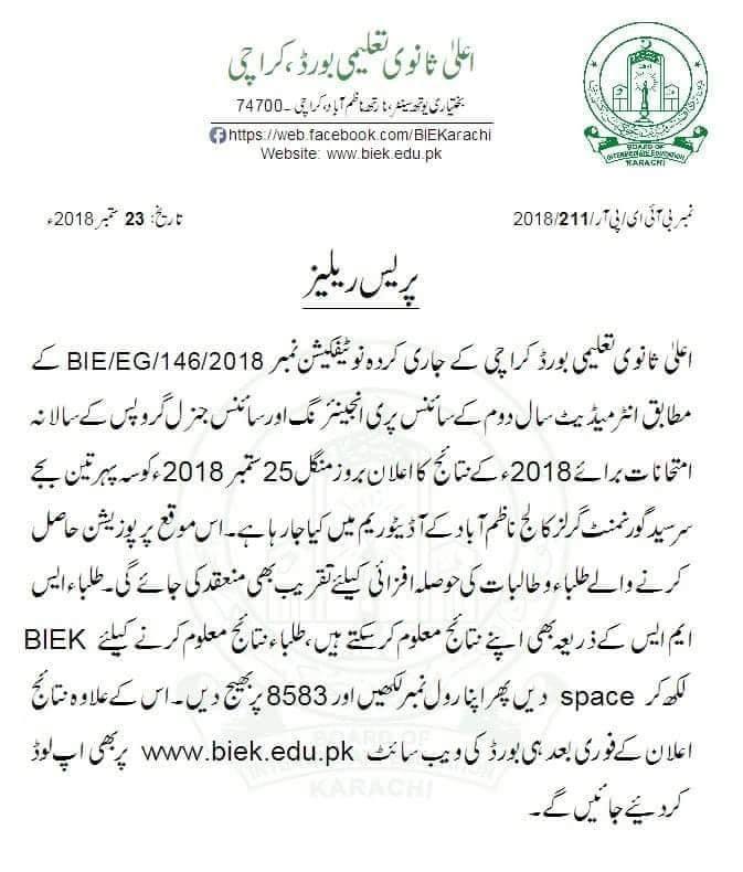 Karachi, Board of Intermediate Education Karachi made the announcement that BIEK Karachi intermediate class result 2018 will be announced on 25 September 2018. Karachi Inter Board will declare BIEK FA/FSc result 2018 will be declared in the Pre engineering and general science groups in the auditorium of Sir Syed Government Girls College Nazimabad. Inter Board Karachi will declare BIEK HSSC result 2018 will be declared with the names of the position holder students and the students will get the result through SMS by sending their roll nos on the number 8583. BIEK Karachi 12th class result 2018 will also be provided on the website of the Karachi inter board.