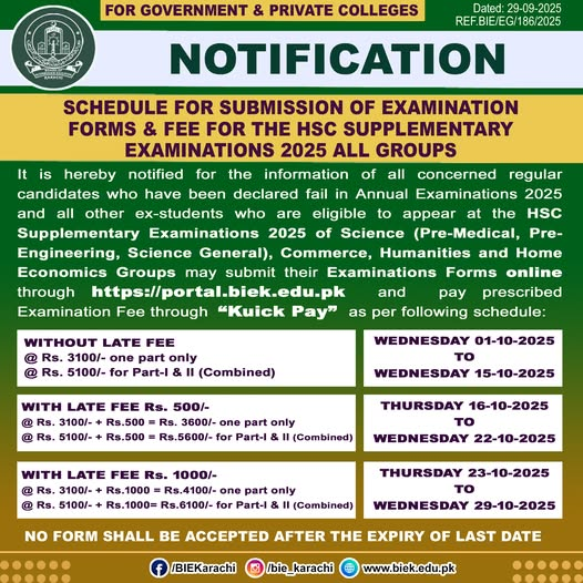 BIEK Karachi HSC Supply Exams 2025 Forms Schedule