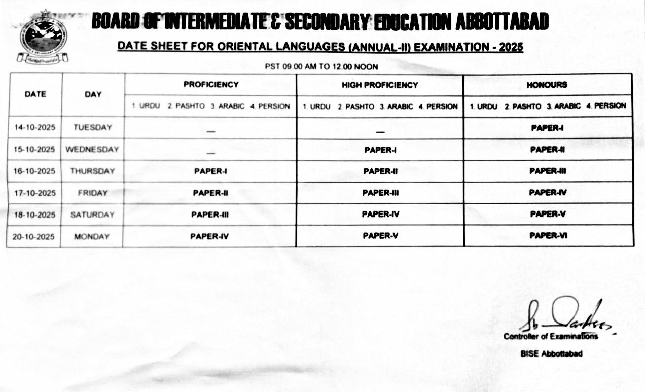 BISE Abbottabad Oriental Languages 2nd Annual Exams 2025 Date Sheet