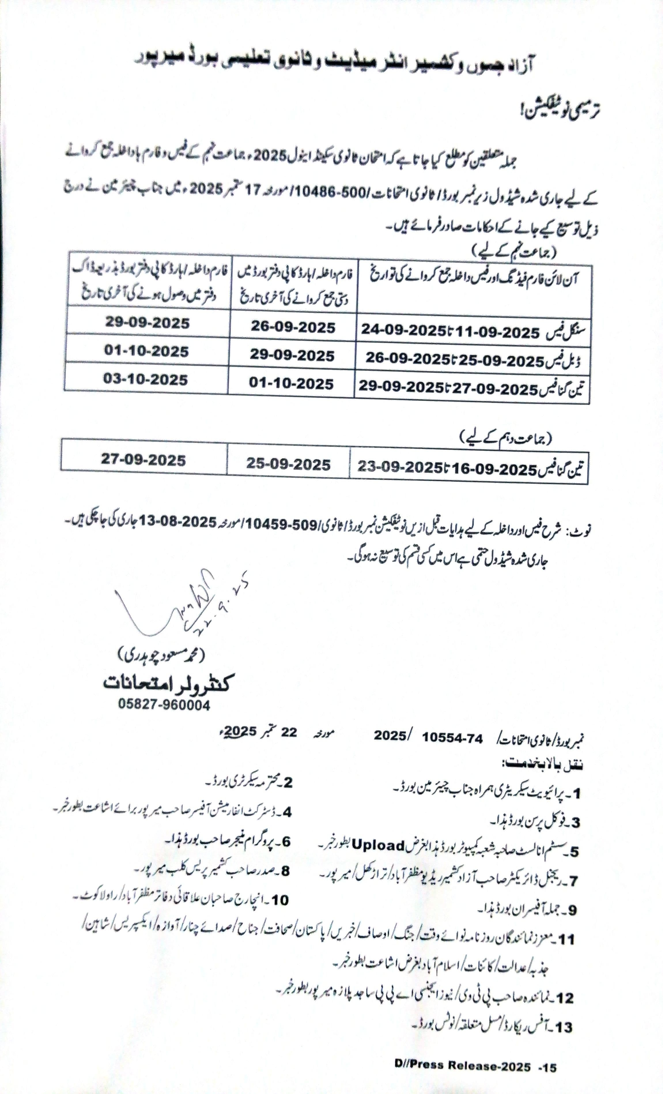 Mirpur, Board of Intermediate and Secondary Education Mirpur AJK is going to start their matric class part 1 second annual exams for the year 2025. The education board started collected the admission forms from the students along with fee to manage their exams. The board has accorded the extension in the forms submission schedule according to their BISE AJK 9th Class 2nd Annual Exams 2025 Extended Forms Schedule.