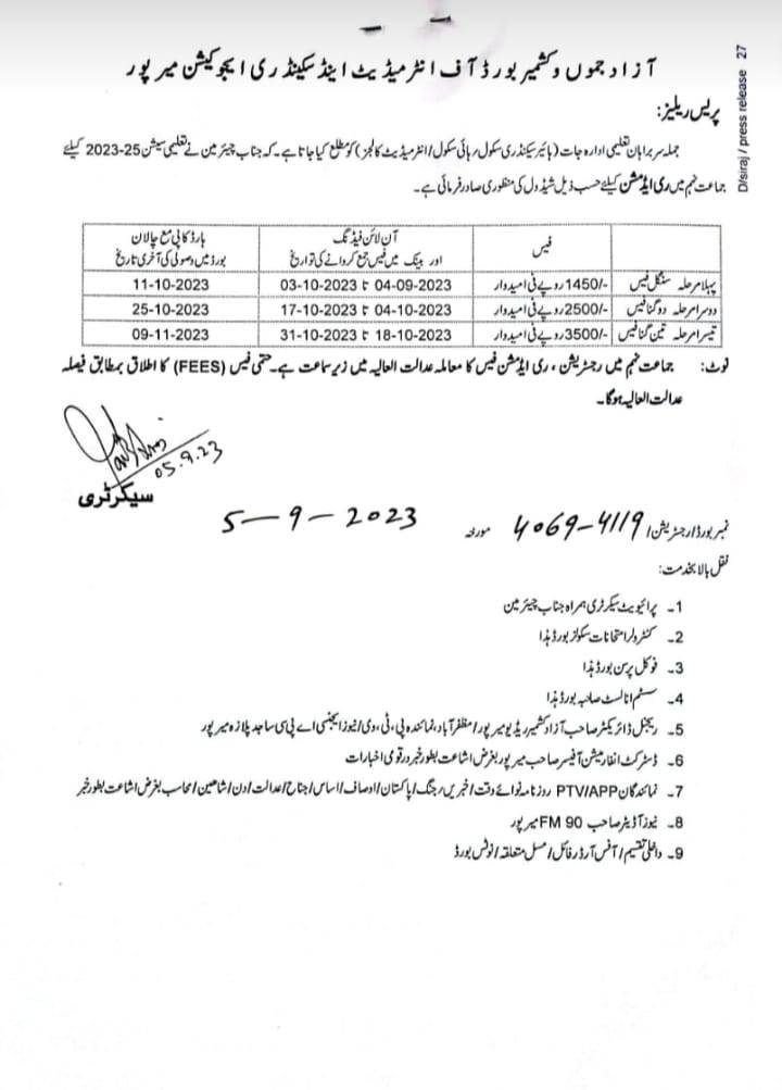 Mirpur, Board of Intermediate and Secondary Education Mirpur, AJK has accorded the approval of the AJK Board SSC Part 1 re-admission 2023-25. The heads of all public and private schools and colleges can note this re-admission schedule. According to the detailed information of BISE AJK 9th Class Re-Admission 2023-25 Schedule, in the first stage, the candidates can send their application forms with the fee of Rs.1450/- per candidate from 04-09-2023 to 03-10-2023 and the can submit the hard copy of the challan and admission forms in the AJK Board office by 11-10-2023.