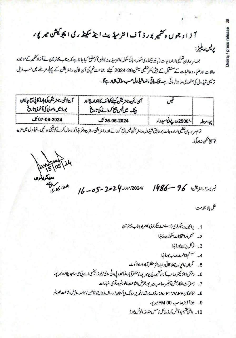 The candidates of AJK Board can submit their enrolment forms with the payment of fee of Rs.2500/- per student in the first stage by the final date of 25-05-2025 and the candidates and their schools are directed to forward the hard copy of the online registration with challan to the board office by the deadline of 07-06-2024. The students will note these dates and they ensure compliance of these final dates as further extension will not be granted.