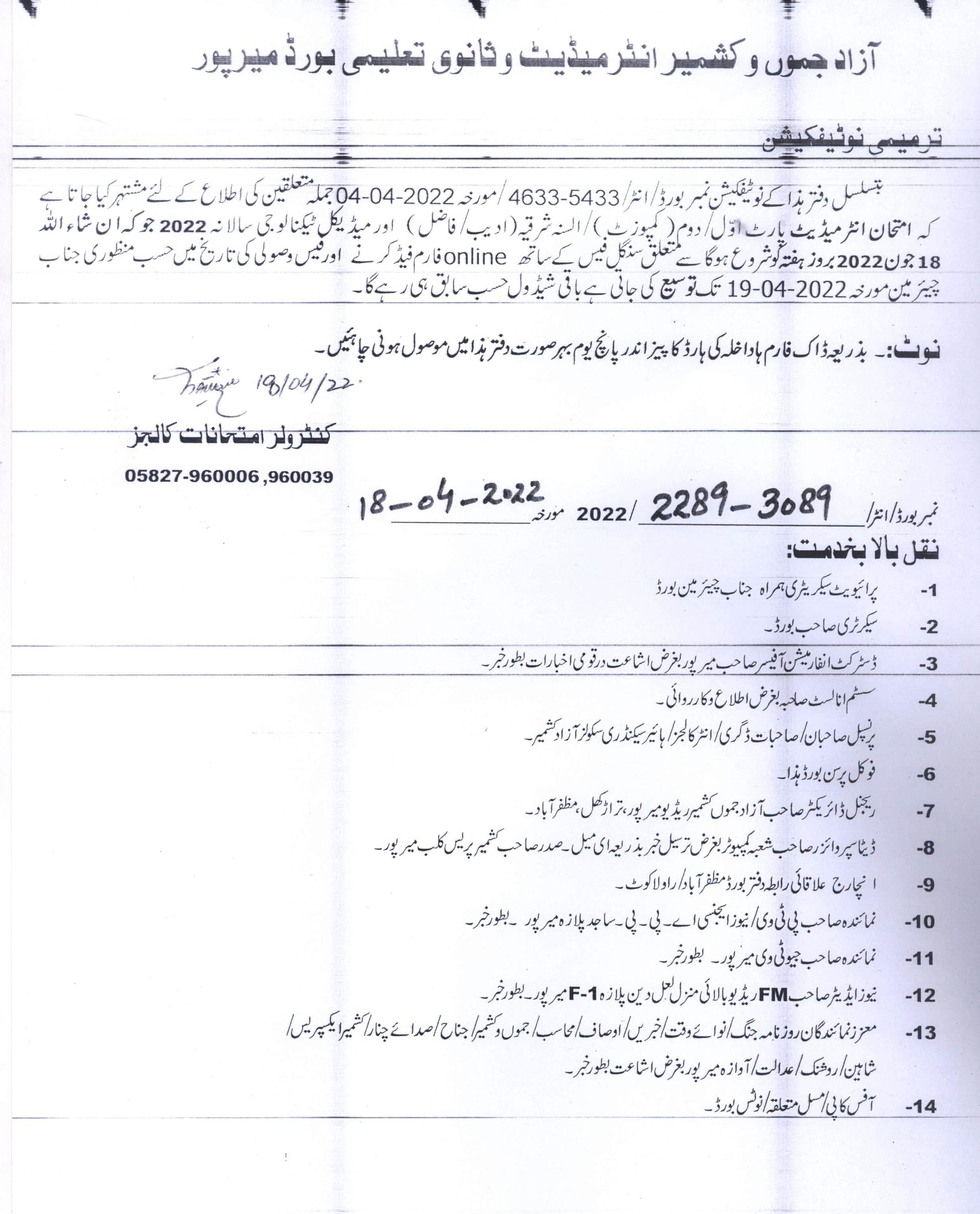 BISE AJK Mirpur Inter Annual Exams 2022 Forms Schedule Extension