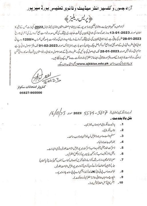 Mirpur, Board of Intermediate and Secondary Education Mirpur, AJK has already announced their BISE AJK Matric 2nd Annual Exams 2022 Result on 13-01-2023. The exams section of AJK Board has issued their BISE AJK SSC 2nd Annual Exams 2022 Result Rechecking Schedule. The candidates can submit their application forms for the re-checking of the answer sheets with the payment of fee by the closing date of 28-01-2023. The candidates will deposit the fee as per Rs.1200/- per paper in the bank and they will send the original bank chalan / receipt through registered mail by the final date of 01-02-2023. The candidates will get the forms from the main office or regional offices or they can download it from the official website of the education board.
