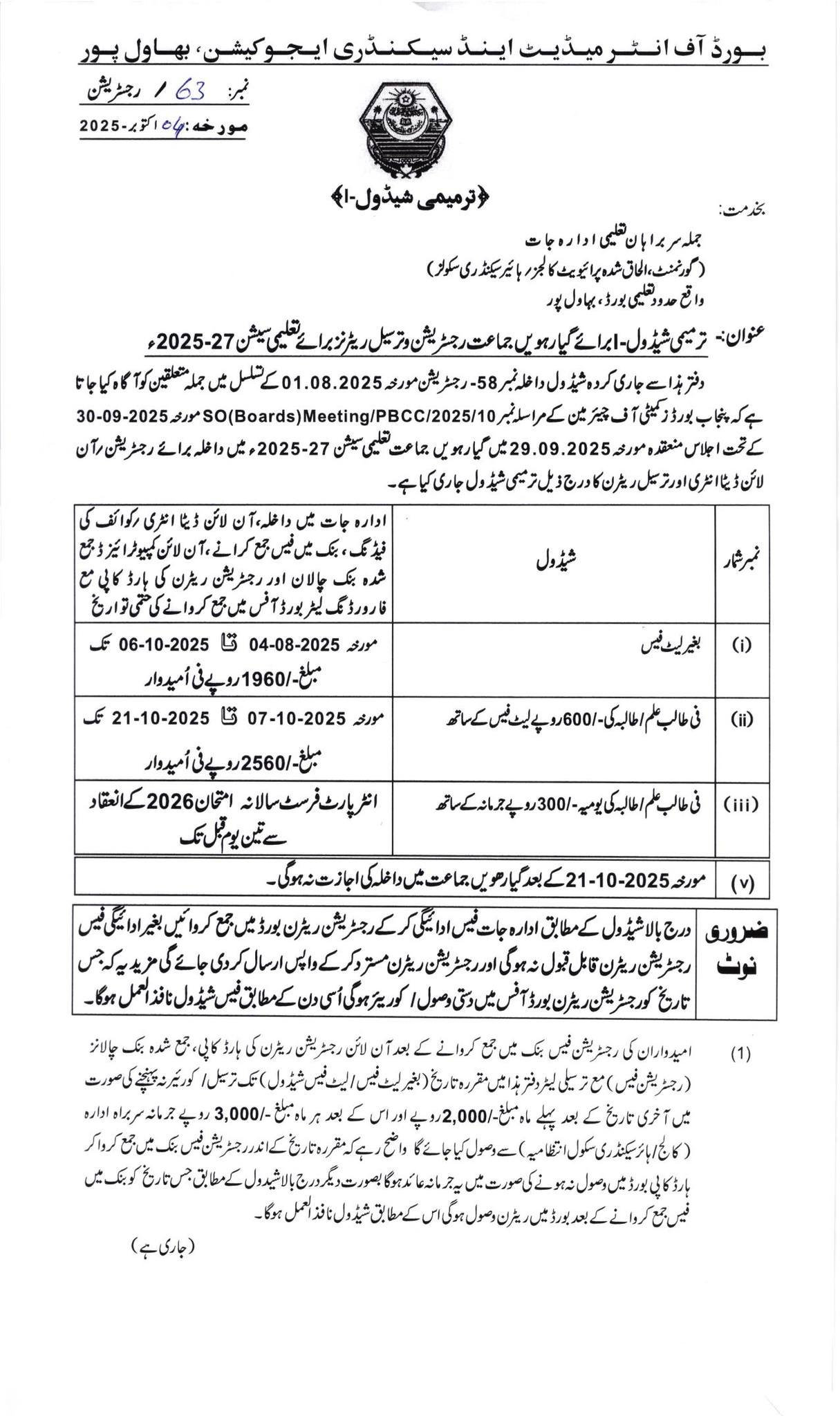 Bahawalpur, Board of Intermediate and Secondary Education Bahawalpur has announced the admission and registration process of the newly admitted students in the intermediate class part 1 for the academic year 2025-27. The exams section has accorded the extension in last date for the submission of the registration forms and fee to the board office in order to facilitate the late admitted students in the government colleges and higher secondary schools. The students can get the latest updates of BISE Bahawalpur 11th Class Admission / Registration 2025-27 Revised Schedule.