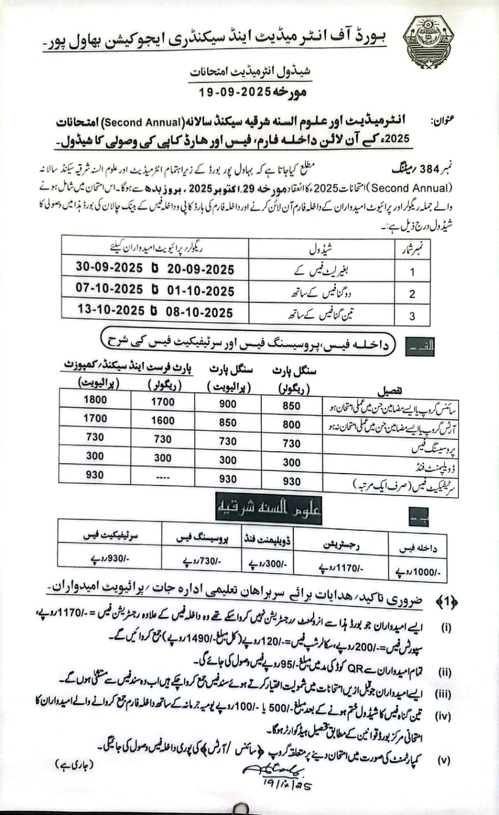 The students will send their application forms to Bahawalpur Board with the payment of single fee from 20-09-2025 to 30-09-2025. The candidates can send their admission forms with the deposit of the double fee from 01-10-2025 to 07-10-2025. The candidates will also send their admission forms and pay the triple fee from 08-10-2025 to 13-10-2025. The students will also note the rate of the fee and they will pay the fee accordingly.