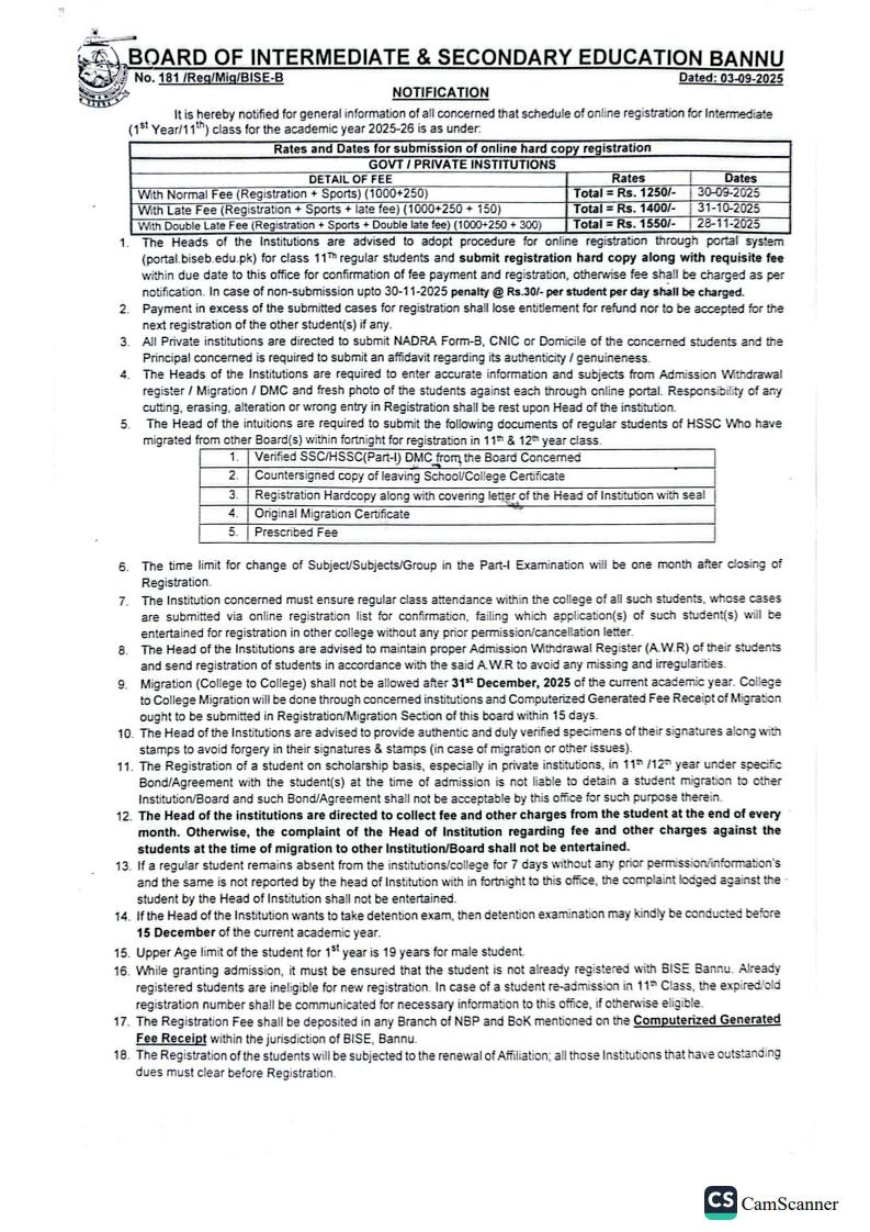 Bannu, Board of Intermediate and Secondary Education Bannu has started the admission process for the intermediate class part 1 for the academic year 2025-26. The students, who got admission in the government colleges and higher secondary schools in the first year class, their institutes will carry out their registration with Bannu Board so that they can appear in the next coming exams. The students and their institutes will note the complete BISE Bannu 11th Class Registration Schedule 2025-26.