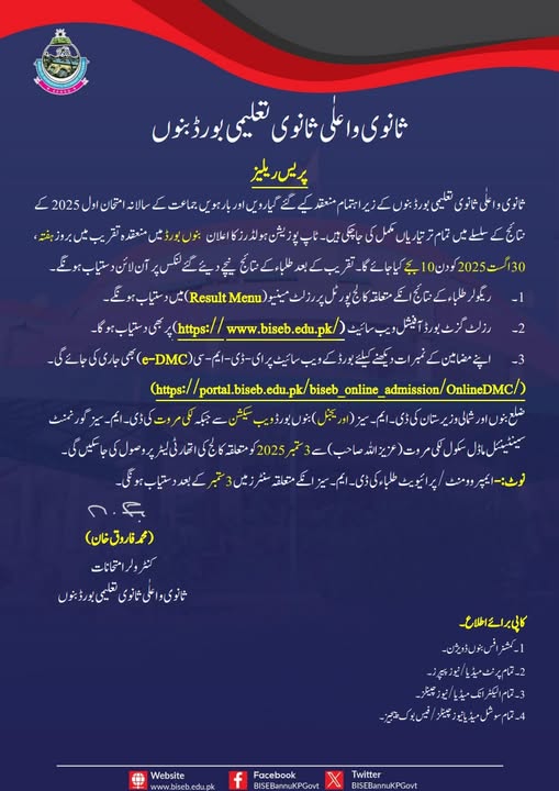 Bannu, the Board of Intermediate and Secondary Education BISE Bannu has completed all necessary preparations for the announcement of the HSSC Part I & II Class 11 & 12 Annual Examination 2025 Results. According to the official press release, the board will declare the names of top position holders in a special ceremony to be held at the Bannu Board auditorium on Saturday, August 30, 2025, at 10:00 AM.