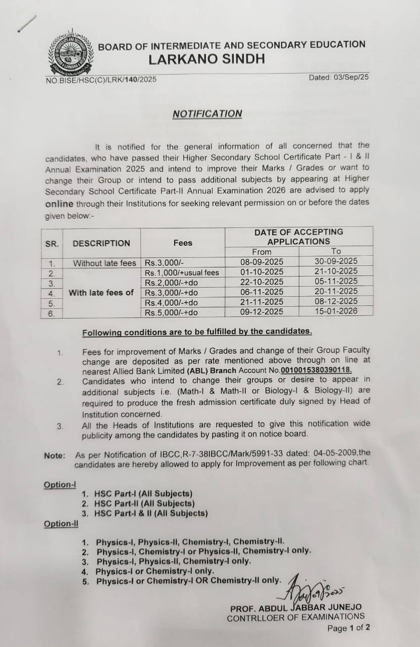 Larkana, Board of Intermediate and Secondary Education Larkana is going to announce the complete schedule for the students, who have already passed their intermediate class annual exams 2025 but they want to improve their marks / grades or they want to change their groups or intend to pass the additional subjects. All such students can have the opportunity to appear in the higher secondary school certificate annual exams being conducted in 2026. The candidates can apply online by submitting their application forms and they need to follow their BISE Larkana HSSC Annual Exams 2026 Improve Marks / Addl Subjects.