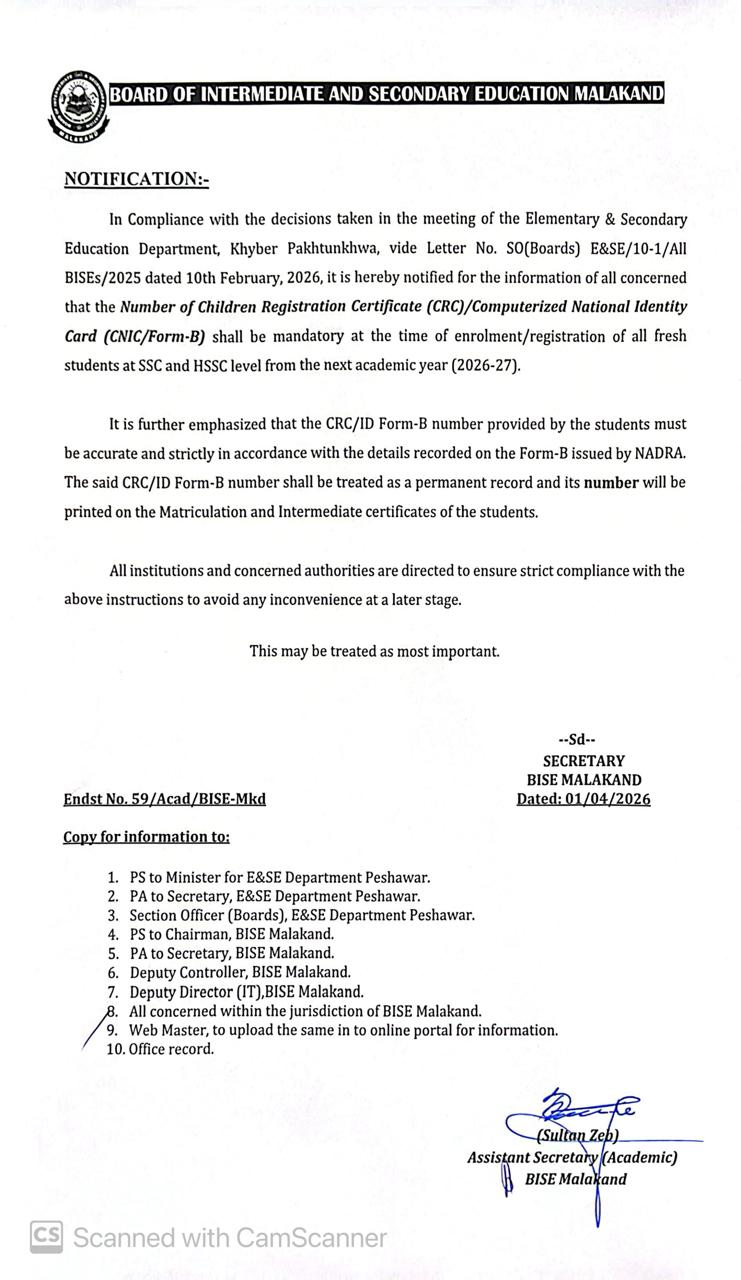 The Board of Intermediate and Secondary Education Malakand has issued a critical notification making the Child Registration Certificate CRC, commonly known as the B-Form, mandatory for all fresh student enrollments starting from the 2026-2027 academic year. In compliance with the Elementary and Secondary Education Department of Khyber Pakhtunkhwa, this new regulation applies to all students entering the SSC and HSSC levels. The directive, signed by the Secretary of BISE Malakand, aims to standardize student identification through official NADRA records, ensuring that every learners academic profile is linked to their legal identity from the outset of their secondary education.