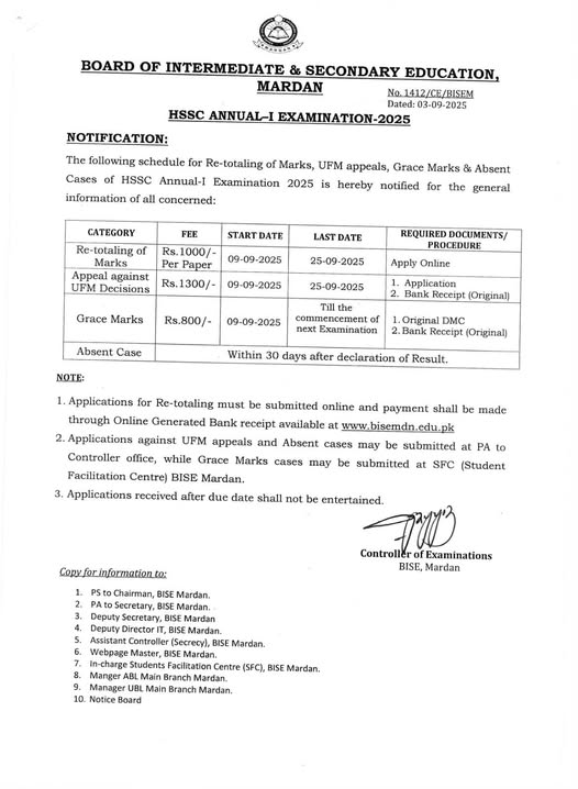 BISE Mardan HSSC Annual Exams Result 2025 Re Totaling Schedule