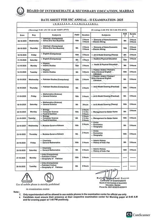 BISE Mardan SSC 2nd Annual Exams 2025 Date Sheet