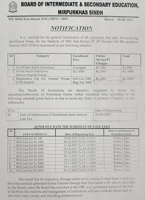 BISE Mirpur Khas 9th Class Enrolment Forms 2025 2026 Schedule