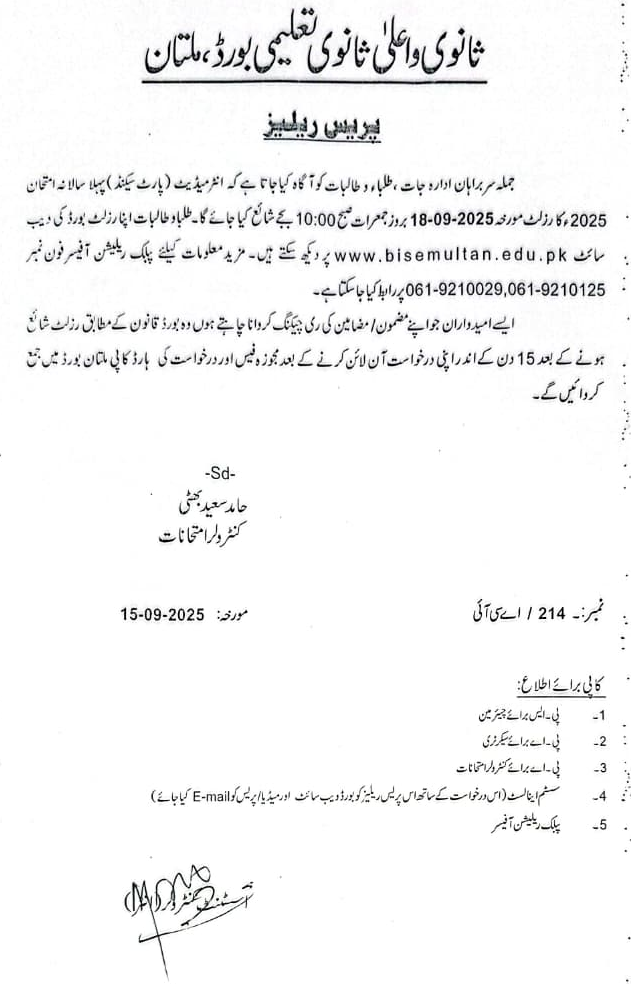 Multan, Board of Intermediate and Secondary Education Multan has already conducted their intermediate class part 2 annual exams on the scheduled dates. The board has started the checking of the answer papers of the participating students and now the education board will declare their 12th class result on 18 September 2025. The students can get the latest updates of BISE Multan Inter 1st Annual Exams 2025 Result on 18 Sep.