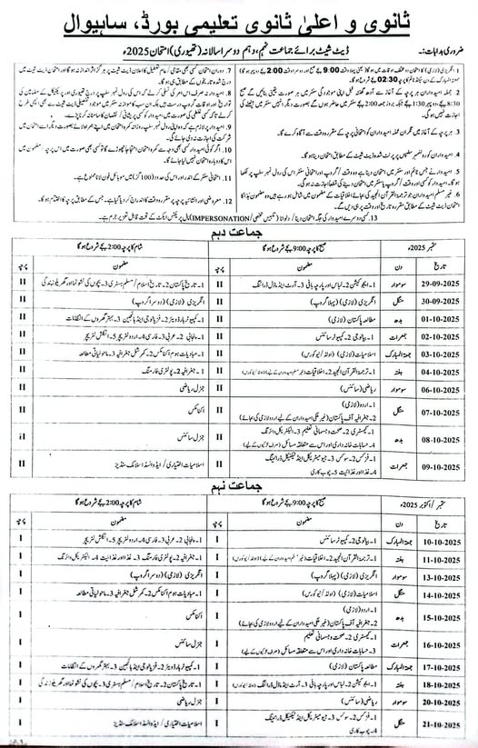 BISE Sahiwal SSC 2nd Annual Exams 2025 Revised Date Sheet