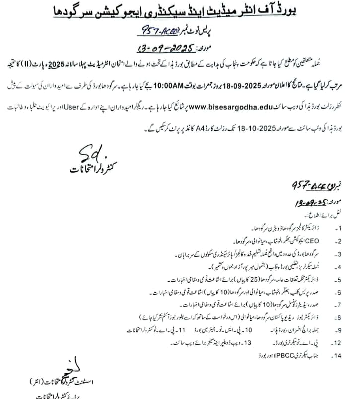 Sargodha, Board of Intermediate and Secondary Education Sargodha has already conducted their intermediate class part 2 first annual exams for the year 2025 on the scheduled dates. The exams section of Sargodha Board took time in checking of the answer sheets of the participating students and will announce their result on 18 September. The students can get the latest updates of BISE Sargodha 12th class 1st annual exams result 2025 on 18 Sep.