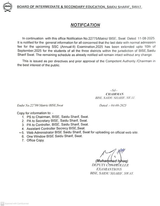 Swat, Board of Intermediate and Secondary Education Swat is making arrangements to manage the matric class second annual exams for the year 2025. The exams department of Swat Board has extended the final date for the submission of the admission forms with the payment of normal admission fee. The students can get latest updates of BISE Swat SSC 2nd Annual Exams 2025 Revised Forms Schedule.