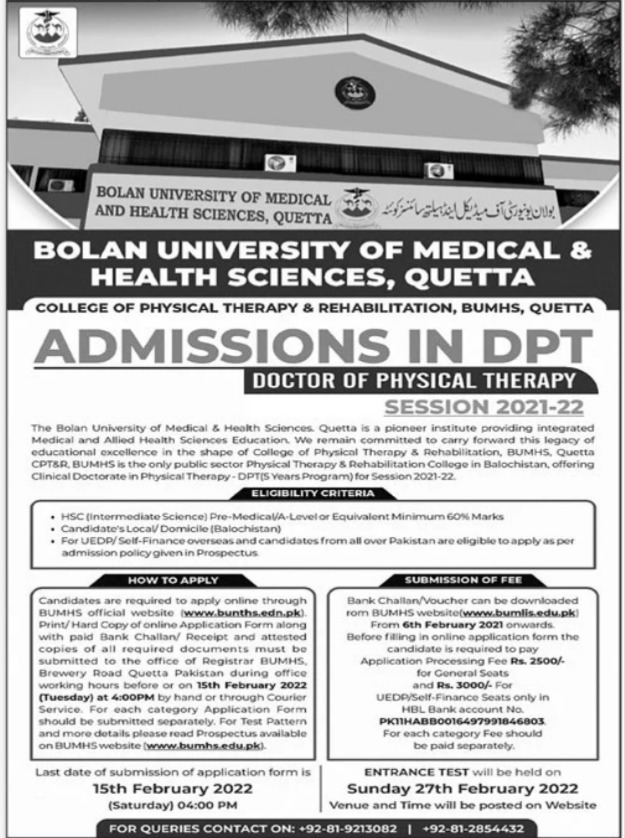 Bolan University of Medical & Health Sciences Quetta intends to offer Allied School Lahore Admissions 2022 and inviting to interested candidates on prescribed forms for granting BUMHS Admissions 2022 in DPT Doctor of Physical Therapy for Academic Session 2021-2022. Candidates passed HSC Pre-Medical / A-Level or equivalent exam with minimum 60% marks are allowed to apply for BUMHS Quetta Admissions 2022. Last date of submission of application forms is February 15, 2022. Entrance Test will be conducted on February 27, 2022. BUMHS DPT Admissions 2022 are ongoing.