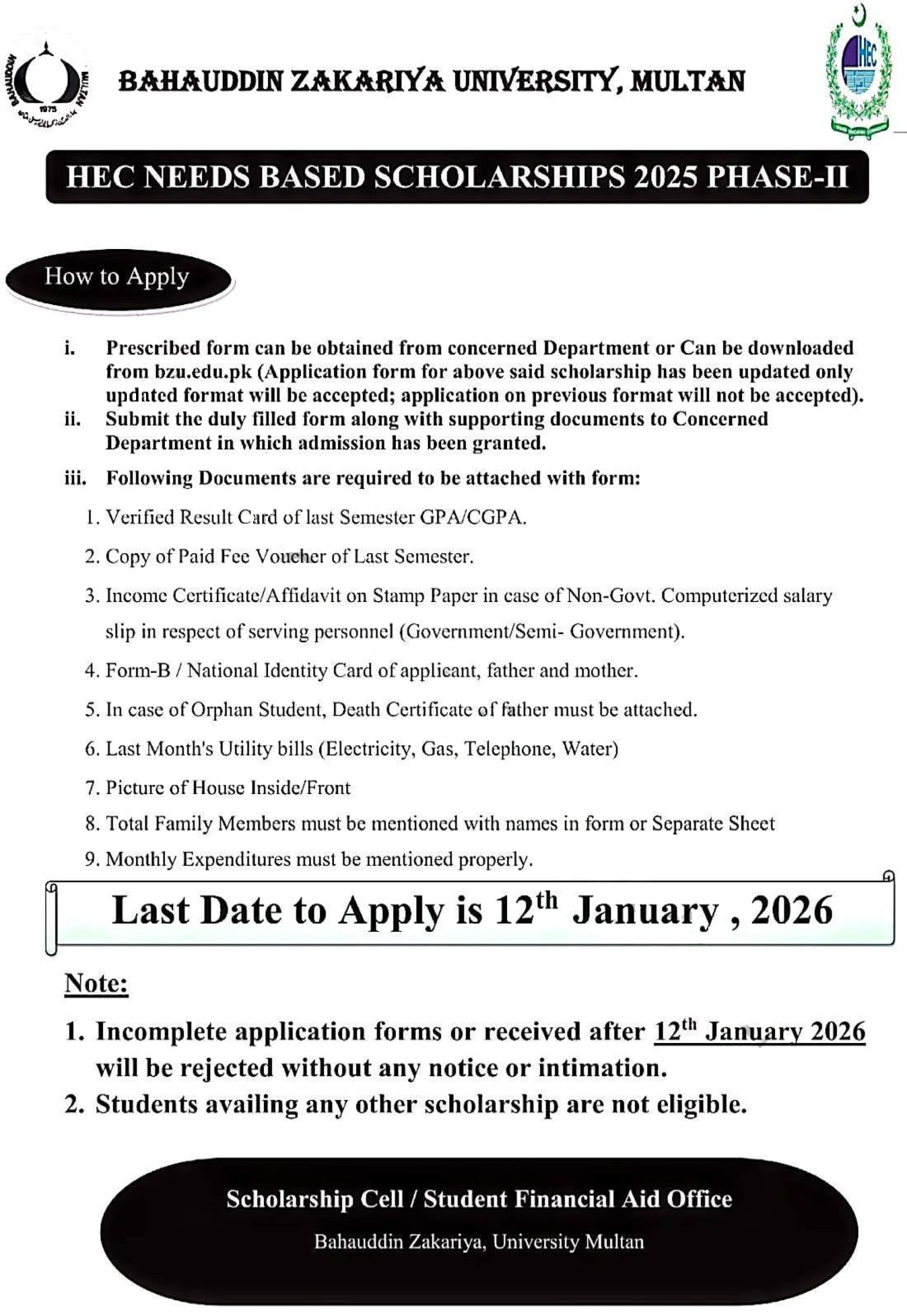 BZU Multan HEC Need Based Scholarships 2025 Phase-II