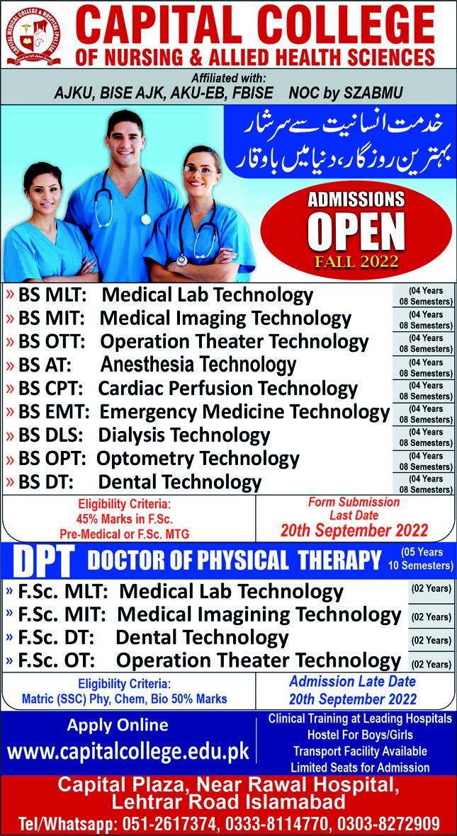 Capital College of Nursing & Health Sciences Islamabad is publicized the Capital College of Nursing & Health Sciences Admissions 2022 for Session Fall 2022. Capital College of Nursing & Health Sciences is offering the Capital College of Nursing & Health Sciences BS Admissions 2022 in Medical Lab Technology, Medical Imaging Technology, Operation Theater Technology, Anesthesia Technology, Cardiac Perfusion Technology, Dialysis Technology, Optometry Technology, Dental Technology, Capital College of Nursing FSc Admissions 2022 are open in Medical Lab Technology, Operation Theater Technology, Dental Technology, Medical Imaging Technology. Capital College of Nursing DPT Admissions 2022 are also being offered. Last date for submission of applications is September 20, 2022. Capital College of Nursing Admissions 2022 are ongoing.
