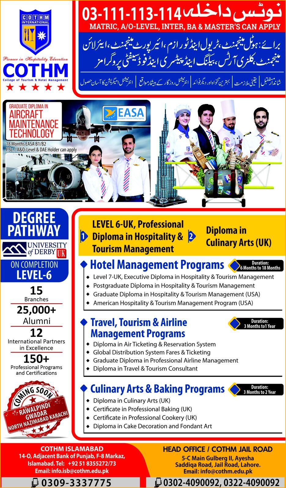 College of Tourism & Hotel Management Islamabad has announced Graduate Diploma in Tourism and Hospitality Management, Culinary Arts and banking and Travel, Tourism and airline management program, Cake Decoration and Fondant Art, Travel & Tourism Consultant.