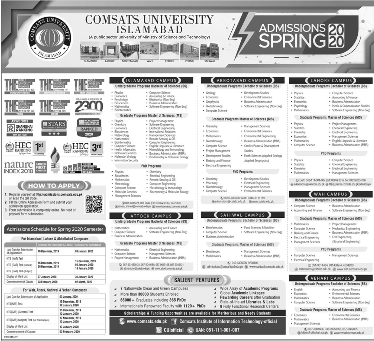 Comsats University BS MS PhD admissions 2019