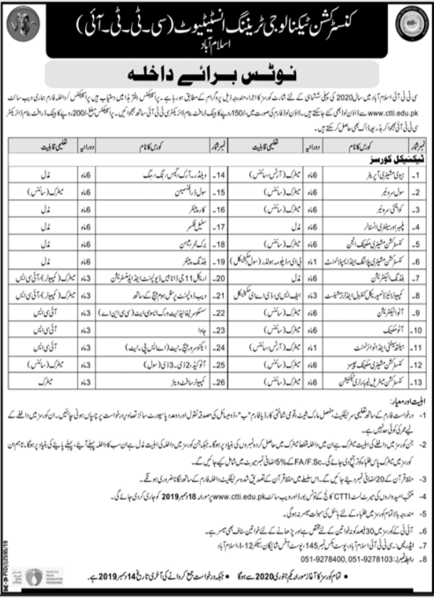 Construction Technology Training Institute Admission 2020