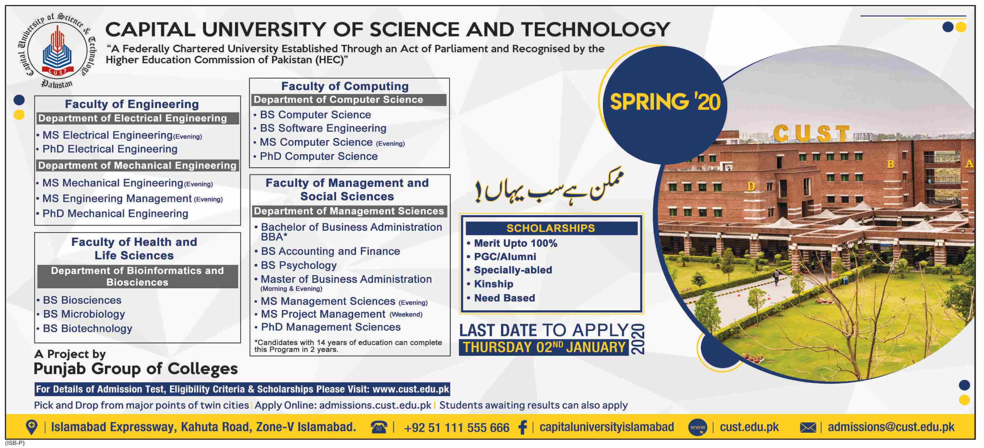 Capital University of Science & Technology Islamabad has offering admissions for BS in Computer Science, Software Engineering, Accounting & Finance, Psychology, Biosciences, Microbiology, Biotechnology, MS in Computer Science, Electrical Engineering, Mechanical Engineering, Engineering Management, PhD in Mechanical Engineering, Computer Science, Management Sciences. Scholarships are available. Last date for submission of admission applications is 02 JAN 2020.