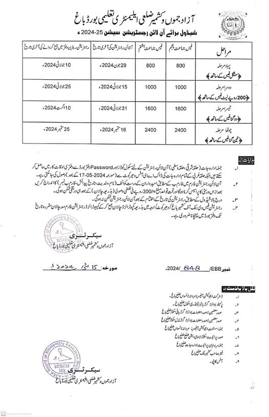The schools can apply for online registration with normal fee of Rs.800/- by the closing date of 29-06-2024. The schools can also send online registration forms of their students will fine of Rs.200/- by the final date of 15-07-2024. The late candidates can also forward their registration forms online with double fee deposit of Rs.1600/- by the deadline of 31-07-2024. The candidates can also avail the final chance of sending their registration forms online with triple fee of Rs.2400/- by the target date of 16-09-2024.