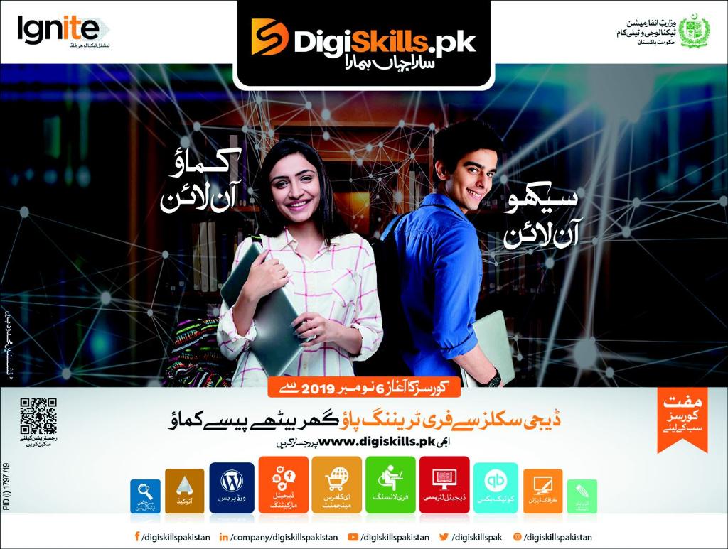 Digi Skills has announced admissions for Free Online Courses in Digital Literacy, Free Lancing, Graphic Designing, Word Press, Auto Cad, Digital Marketing, Search Engine Optimization, E-Commerce Management. Free Earn & Free Learn. Last date for submission of admission applications is 6 Nov 2019.