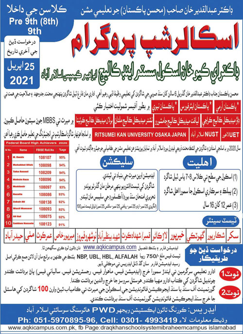Dr A Q Khan School System Isb Class IX Admissions 2021