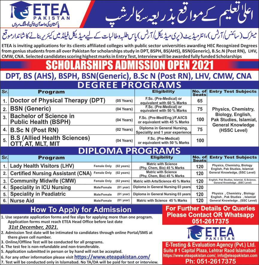ETEA Islamabad is accepting applications for its client affiliated colleges with public sector universities awarding HEC Recognized Degrees from genius students from all over Pakistan for Scholarships in DPT, BD Public Health, BS Allied Health Sciences, BS Nursing Generic, BSc Nursing Post RN, Lady Health Visitor, Certified Nursing Assistant CNA, Community Midwife SMW, Specialty in ICU Nursing, Specialty in Peadiatric, Nurse Aid. Candidates who got highest score in Entry Test and Interview will be awarded fully funded Scholarships. Interested candidates are required to send their Applications at ETEA Head Office on or before December 31, 2021. Admissions are open.