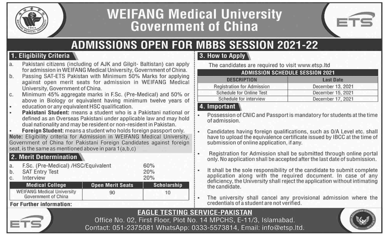Educational Testing Service ETS Islamabad offers MBBS Admissions 2021-22 for WEIFANG Uni China
