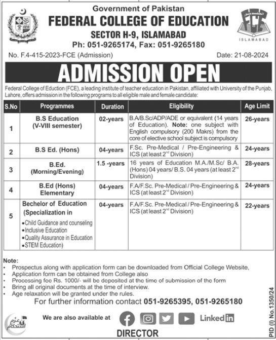 The Federal College of Education a premier institution for teacher education in Pakistan, is now accepting applications for its diverse range of programs. Affiliated with the University of the Punjab, Lahore, FCE offers an array of programs designed to cater to various educational needs and career aspirations. Below are the details for the admission process for the academic year 2024.