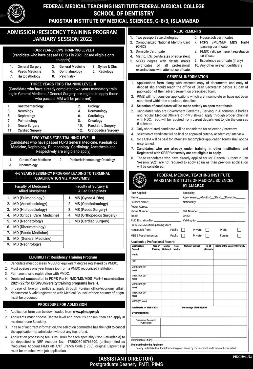 Federal Medical Teaching Institute along with Federal Medical College, School of Dentistry, and Pakistan Institute of Medical Sciences are offering admissions into multiple courses in the year 2022. These Medical Diplomas ar being offered by these Medical Institutes, General Surgery, Paeds Medicine, Histopathology, Psychiatry, Opthalmology, General Medicine, Radiology, Gynae & Obs. More programmes are mentioned in the ad below. Candidates who want to take admission for these courses can apply to one of these institutes. The eligibility criteria for admission in Residency Training Programme is Candidate must Possess MBBS or equivalent degree registered by PMDC, Candidates must have 1-year house job from a PMDC Recognized Institution. Registration with PMDC should Be Valid and Permanent. Candidates can visit the website of pims to download the application form.